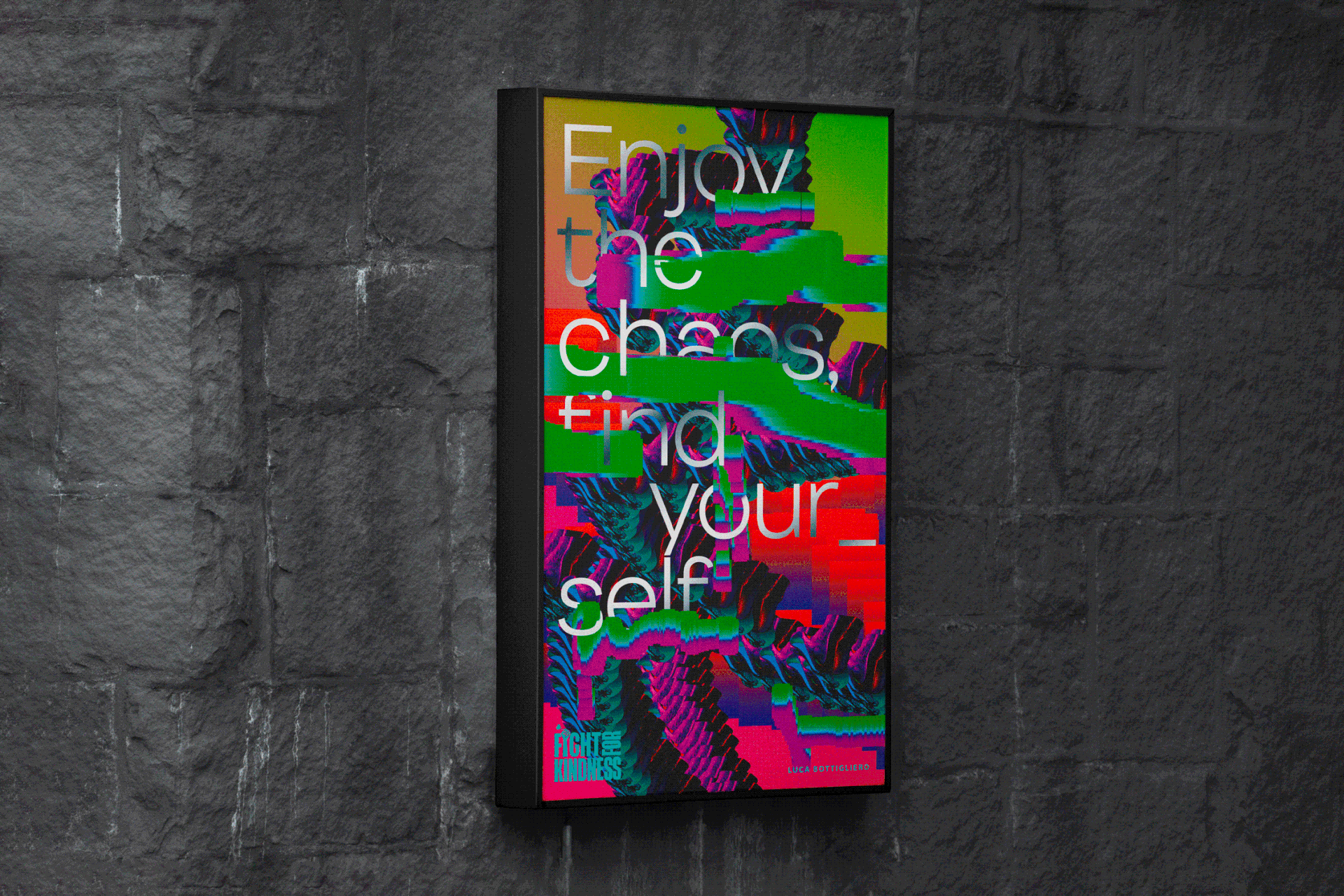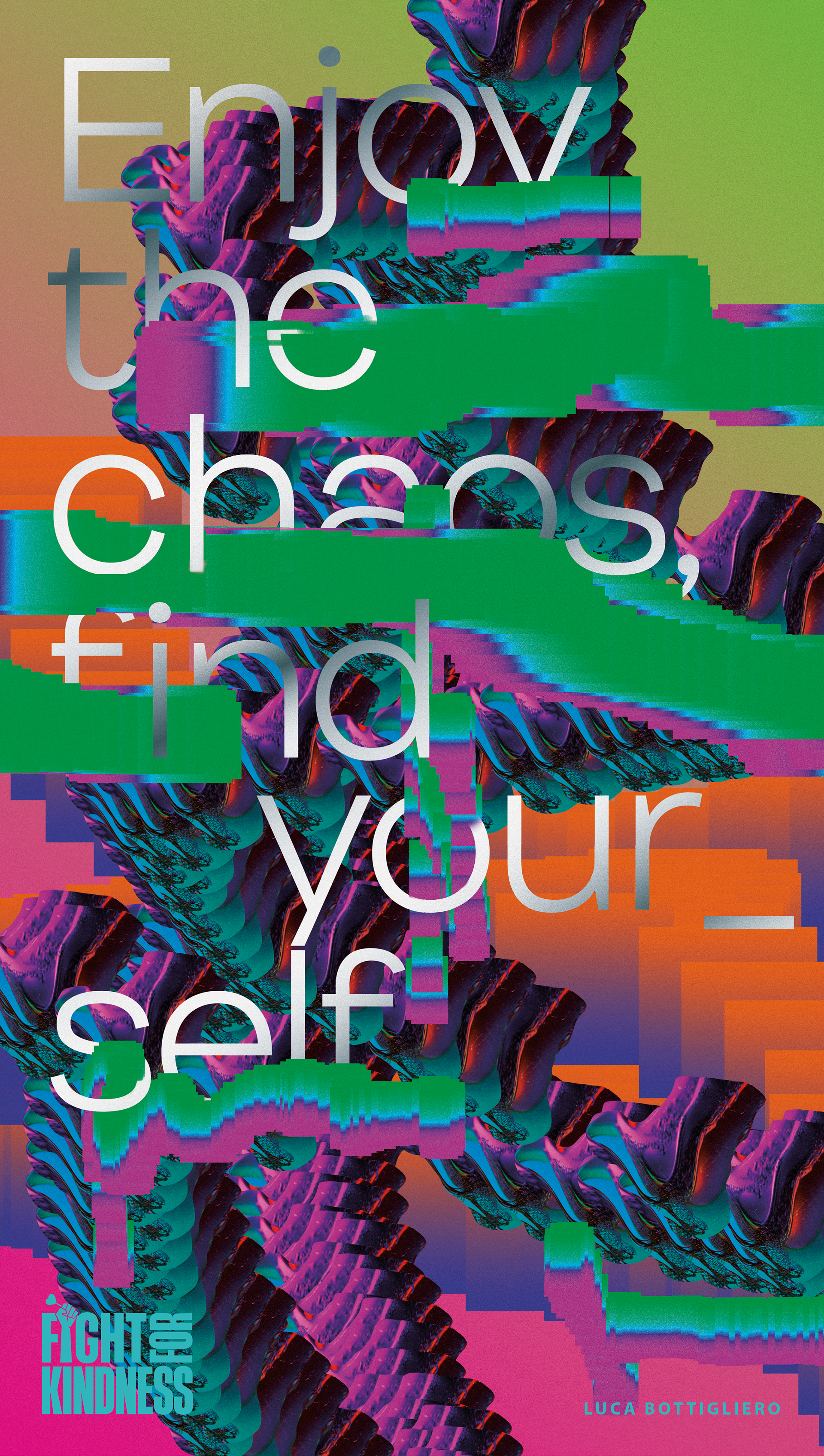< Left side Enjoy the Chaos, Find your self – This poster invites us to see differences一 in people and things一not as a threat, but as a starting point. Through a visual made of distortion and glitch一in both form and type一it reflects a mindset: transformation happens when we start exploring. In the chaos, we might just meet ourselves.»