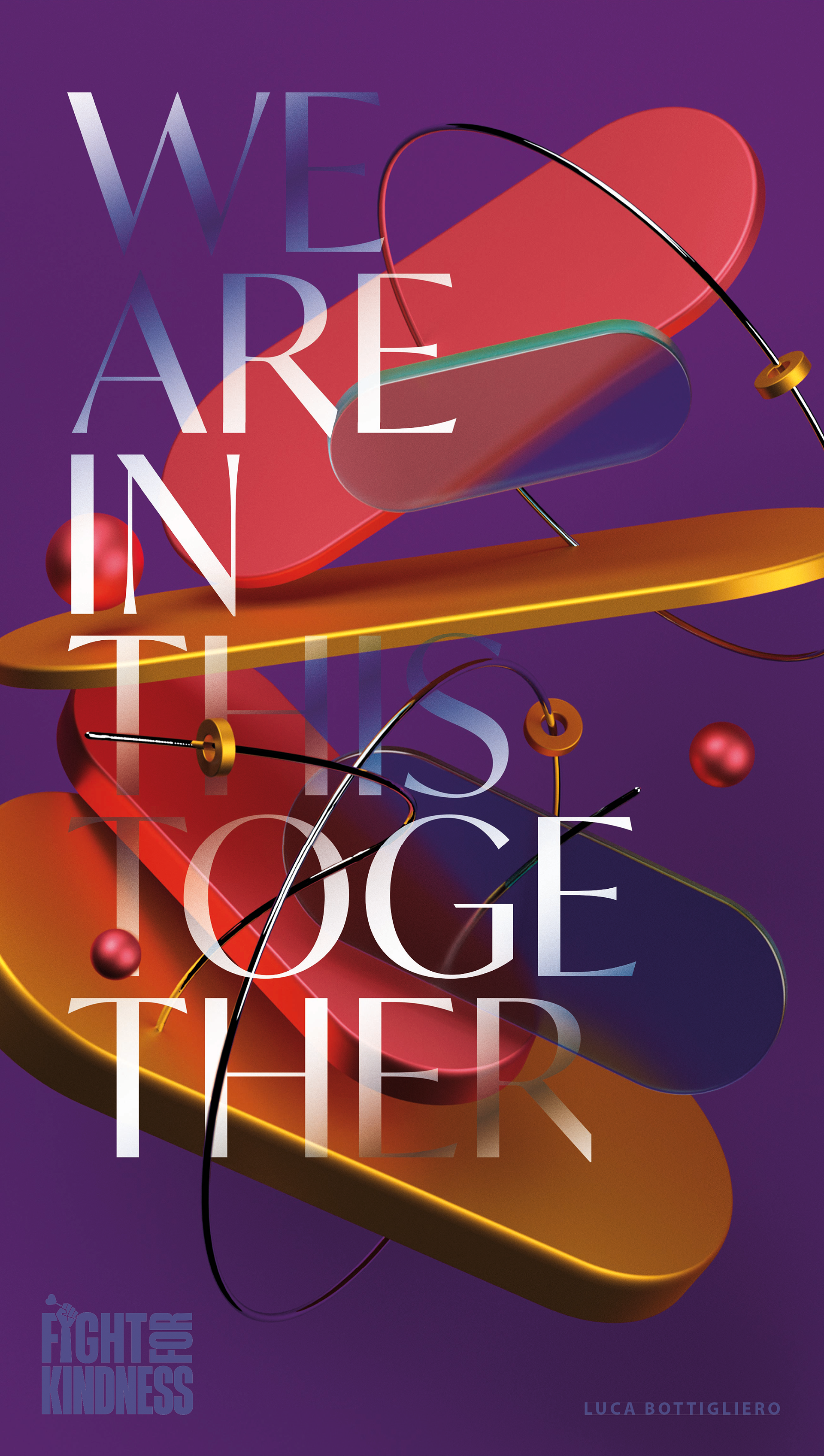 > Right side We are in this together – Borrowing the title from a Nine Inch Nails song, this poster transforms type and 3D structures into a system of mutual support. As elements connect, cross, and hold each other, the message becomes physical: we are not alone一We stand because we stand together.
